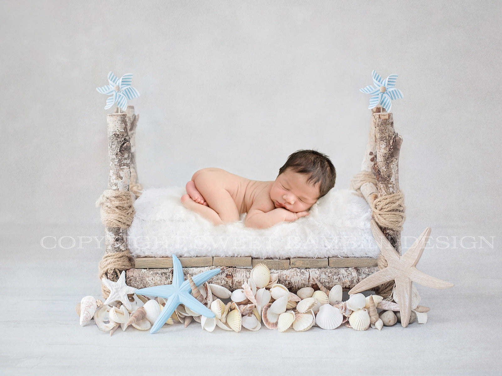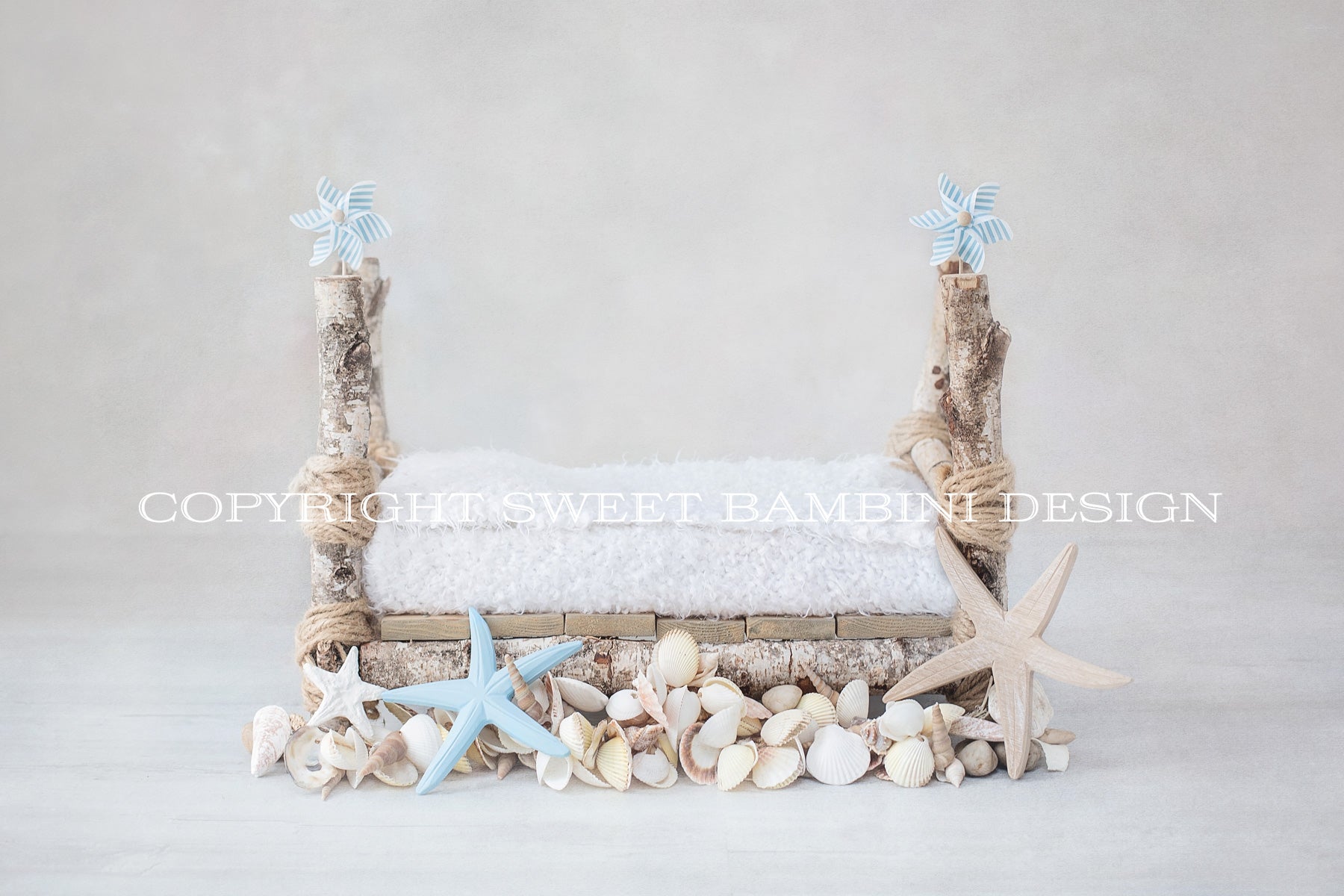 Newborn Photography Digital Backdrop - Little wooden bed with a seaside theme. Sea shells, starfish and cute blue windmills make this perfect for little girls or boys. Baby not included!