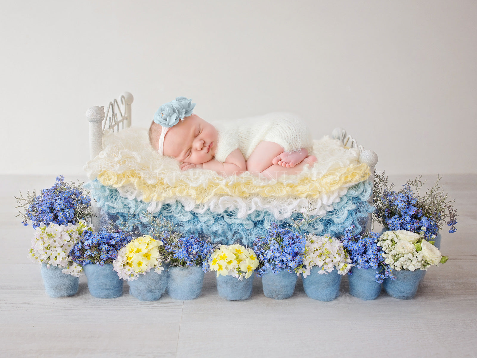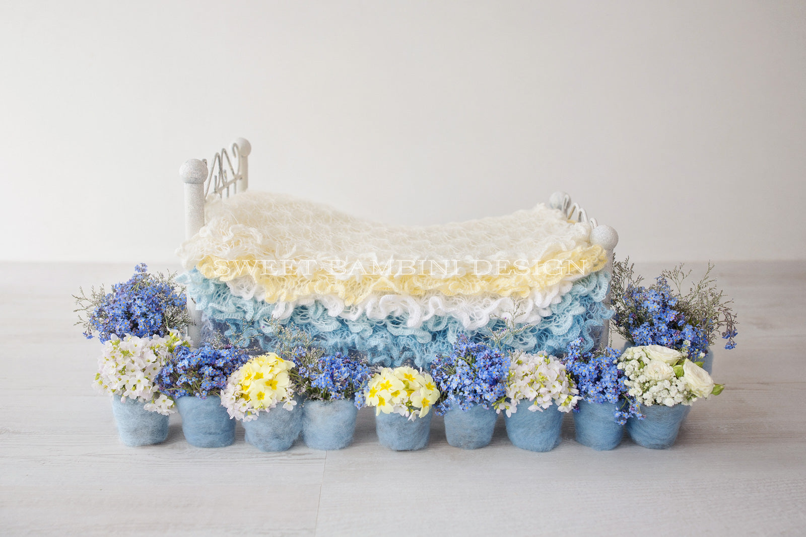 Newborn Photography Digital Photography Backdrop - beautiful little bed decorated with forget-me-nots and mixed, springtime, wild flowers.