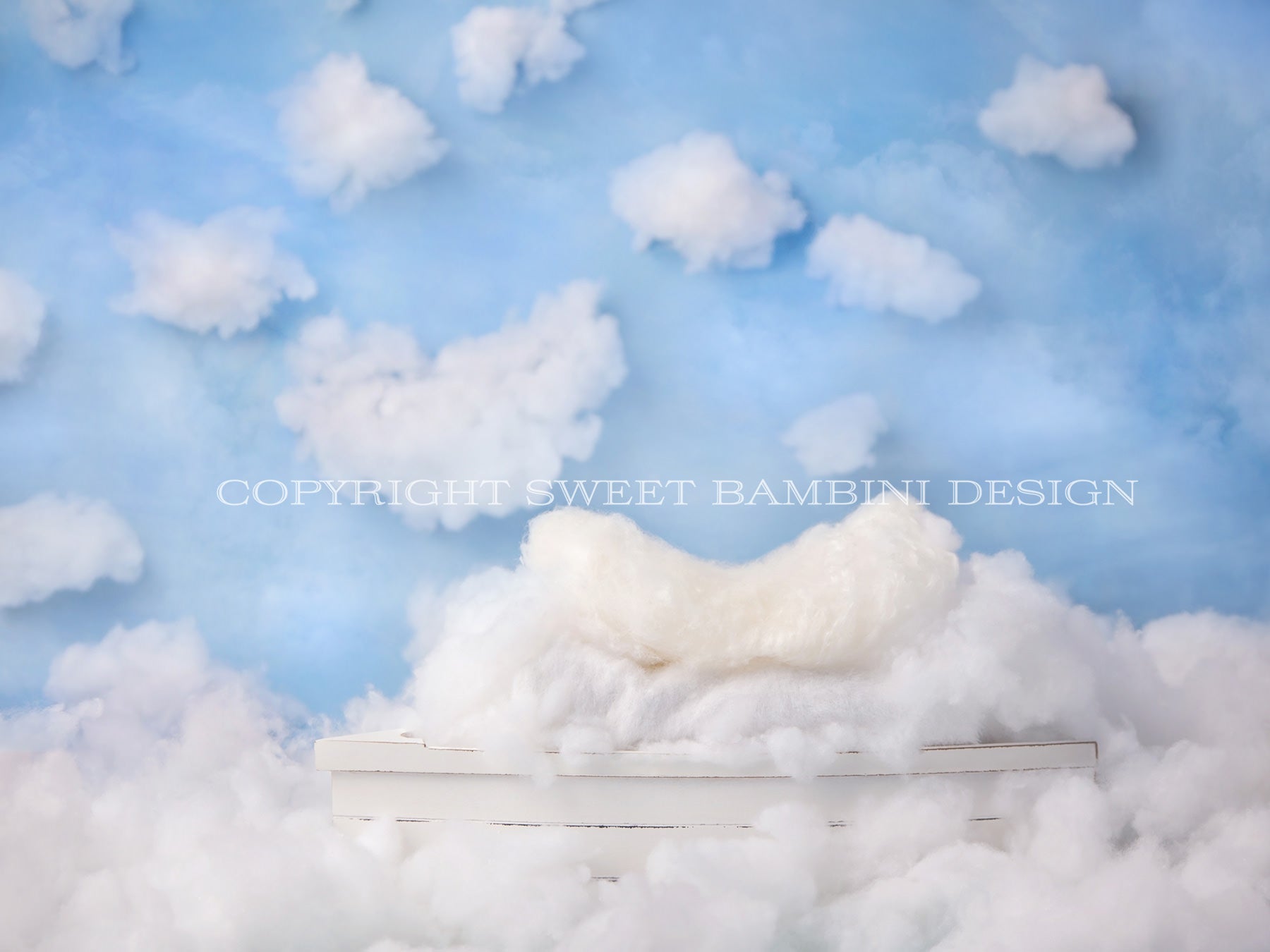 Newborn Photography Digital Photography Backdrop - striking, white fluffy nest on top of a little boat set blue sky background, with fluffy white clouds.