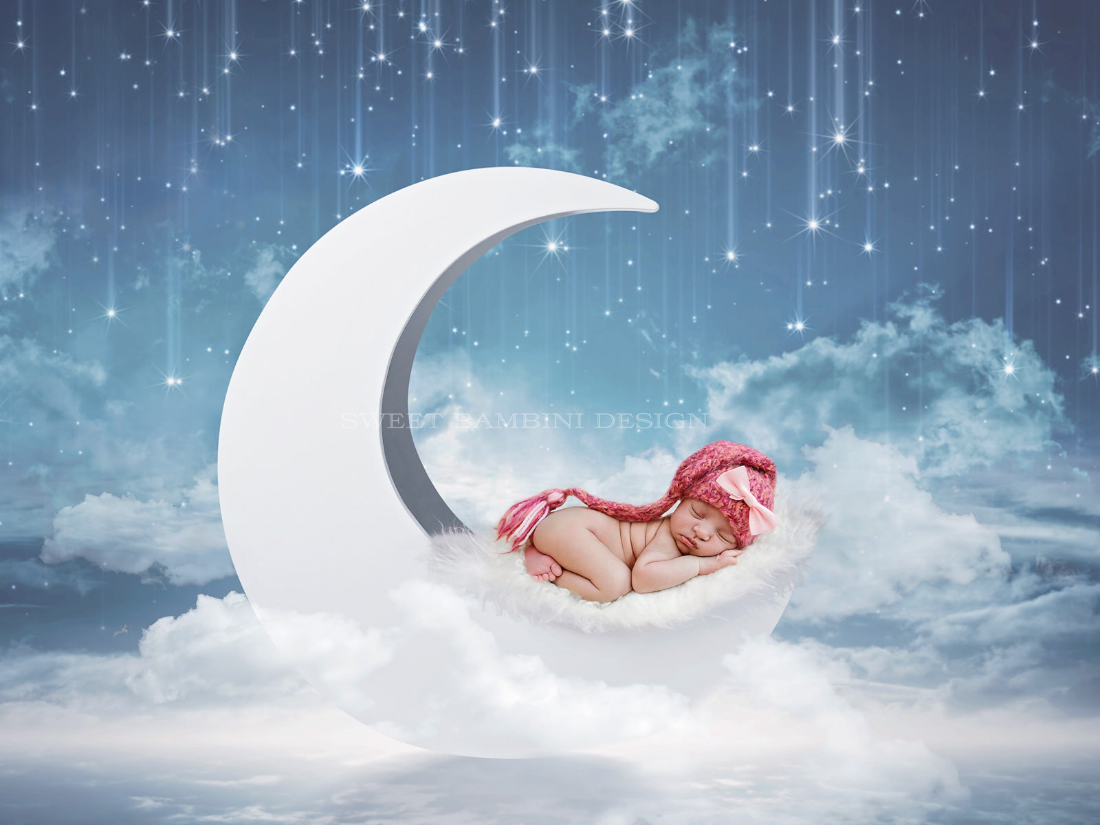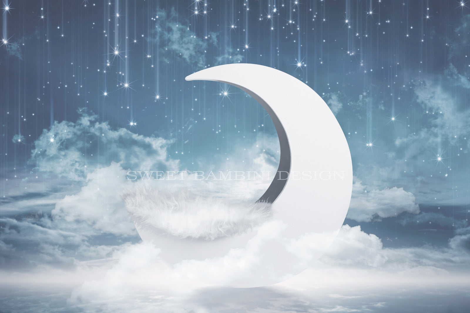 Digital Photography Backdrop - Lovely little white moon on blue background, surrounded by fluffy clouds and stars.