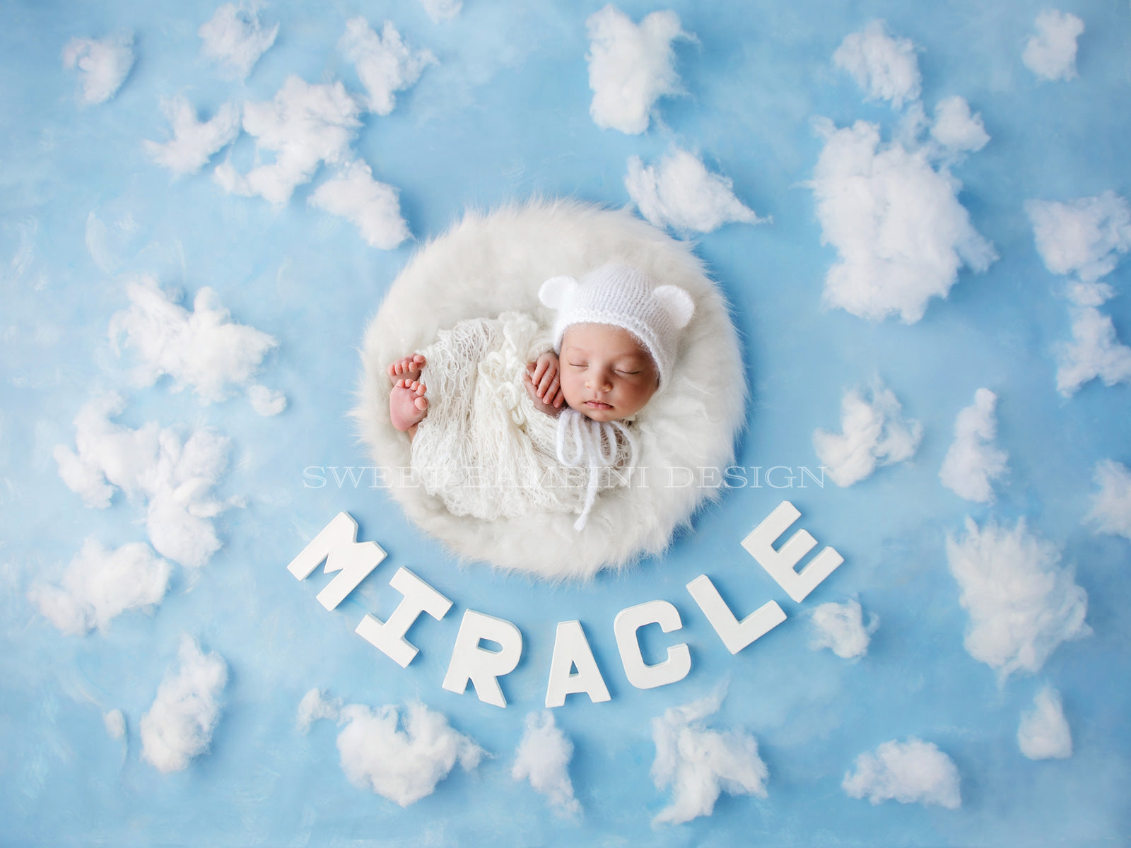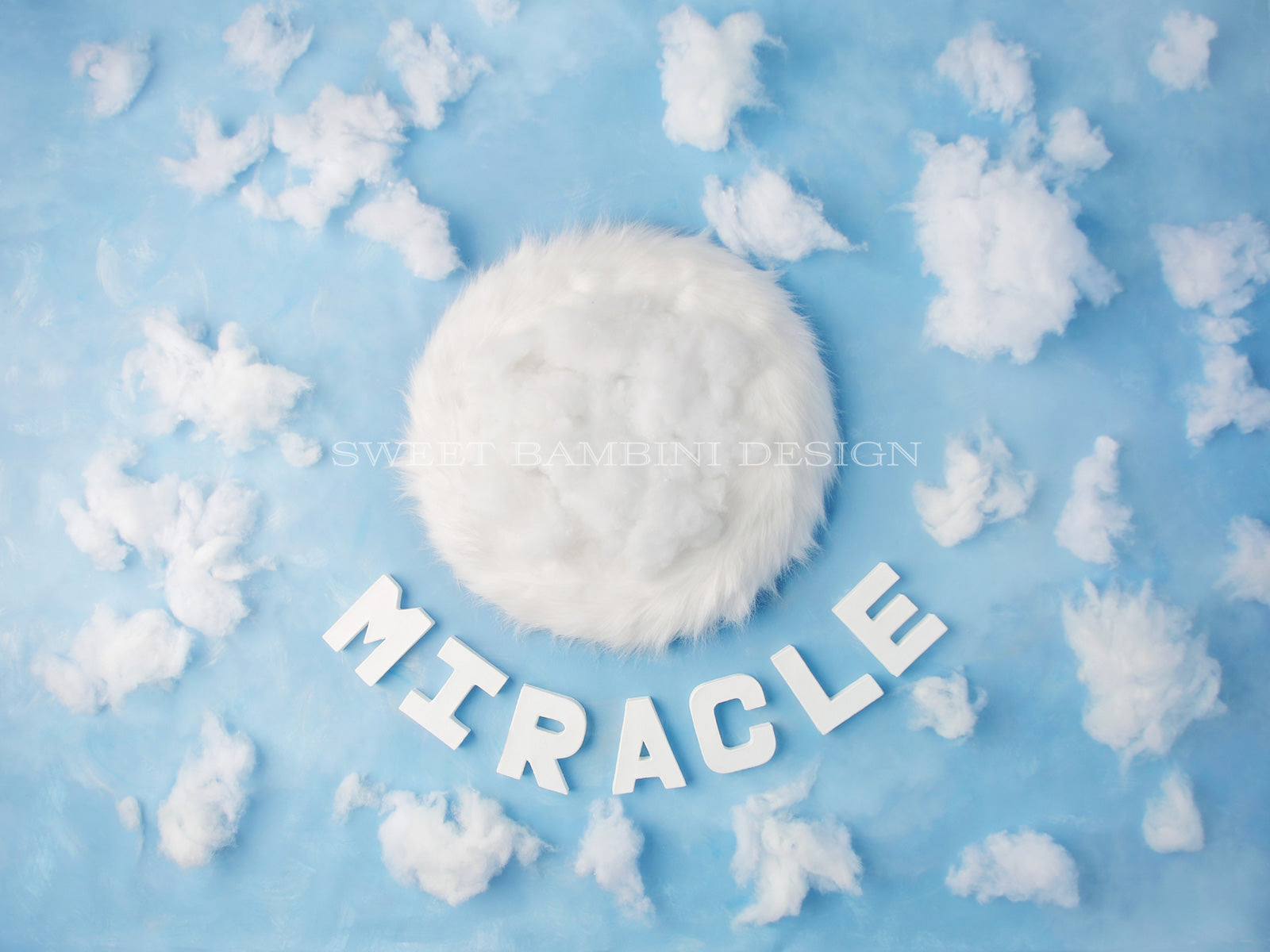 Newborn Photography Digital Photography Backdrop - striking, white fluffy nest set on a blue sky type background, with fluffy white clouds. The addition of the word MIRACLE, makes this backdrop stand out and is perfect for use with all the miracle babies out there. Perfect alternative to the usual rainbow baby backdrops.