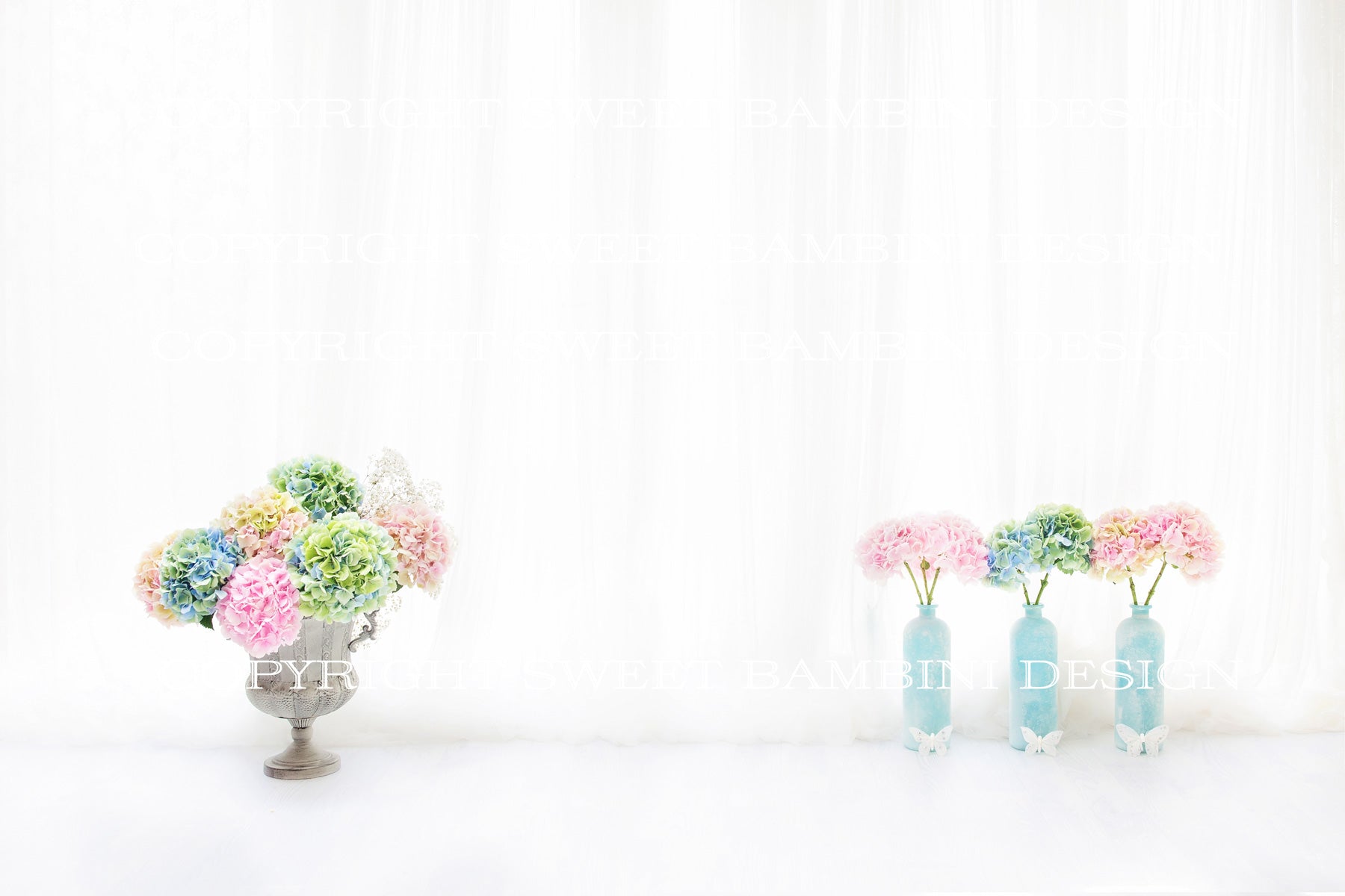 Maternity Digital Backdrop - Beautiful multicoloured hydrangeas in vases against a backlit window
