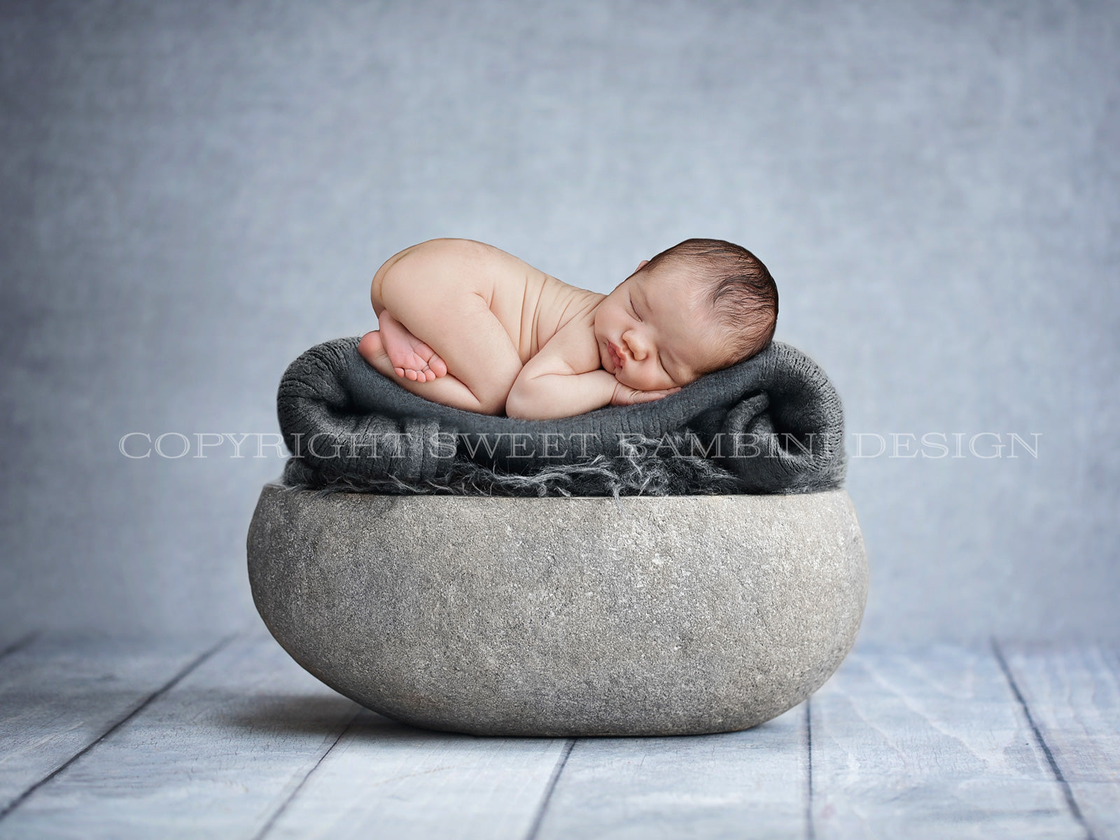 Newborn Digital Backdrop - Natural stone bowl, with a dark grey blanket rolled up to make a comfy space for the baby. Lovely, classy & simple.