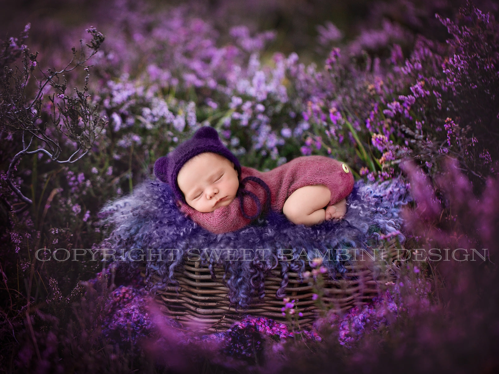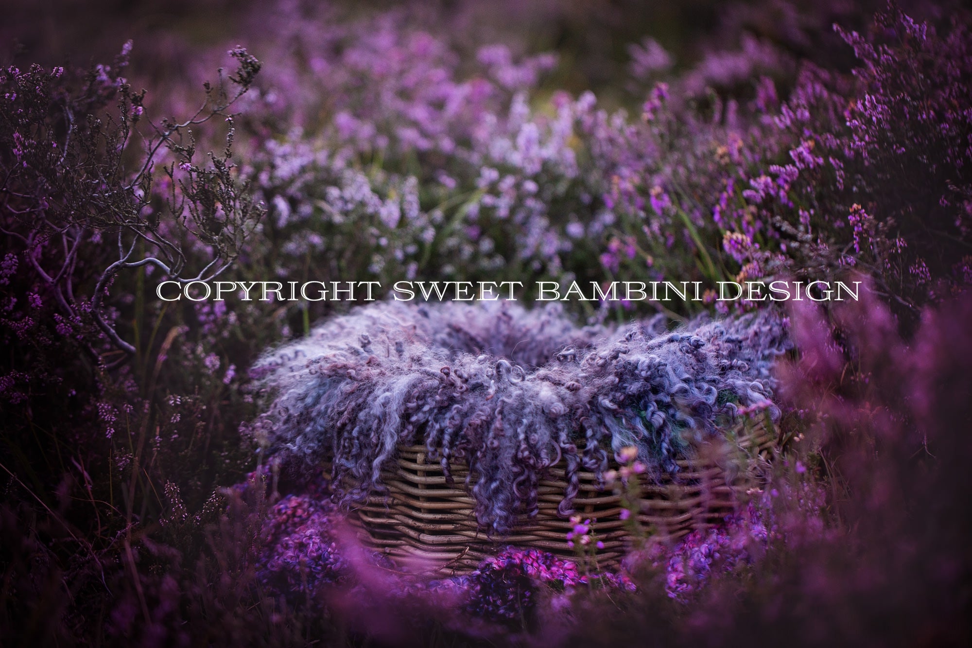 Newborn Photography Digital Backdrop - Lovely little purple wicker basket set amongst natural heather in the New Forest. Shot using natural light.