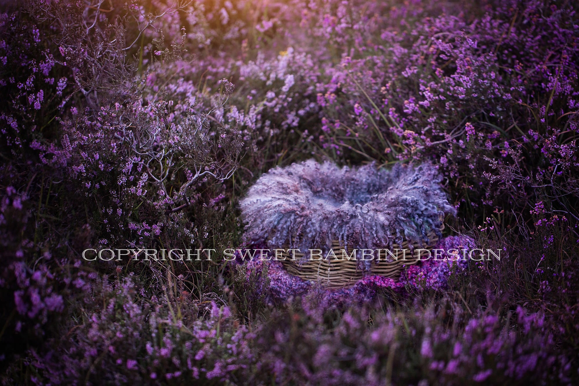 Newborn Photography Digital Backdrop - Lovely little purple wicker basket set amongst natural heather in the New Forest. Shot using natural light.