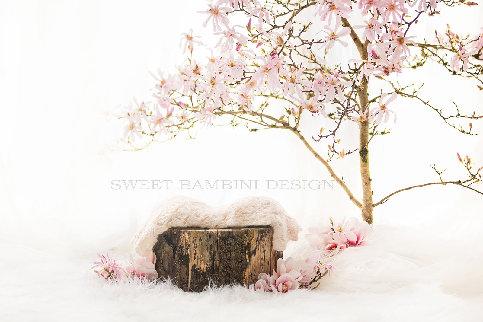 Newborn Photography Digital Photography Backdrop - beautiful natural setting under real Magnolia Tree, with real tree stump surrounded by fresh and silk magnolias.