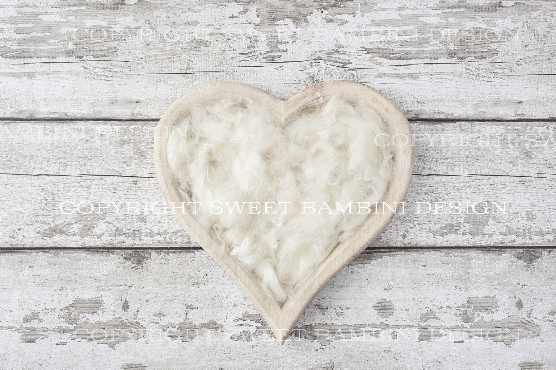 A simple white wooden heart bowl with a white fluffy middle, with a off white/light grey wood plank background.