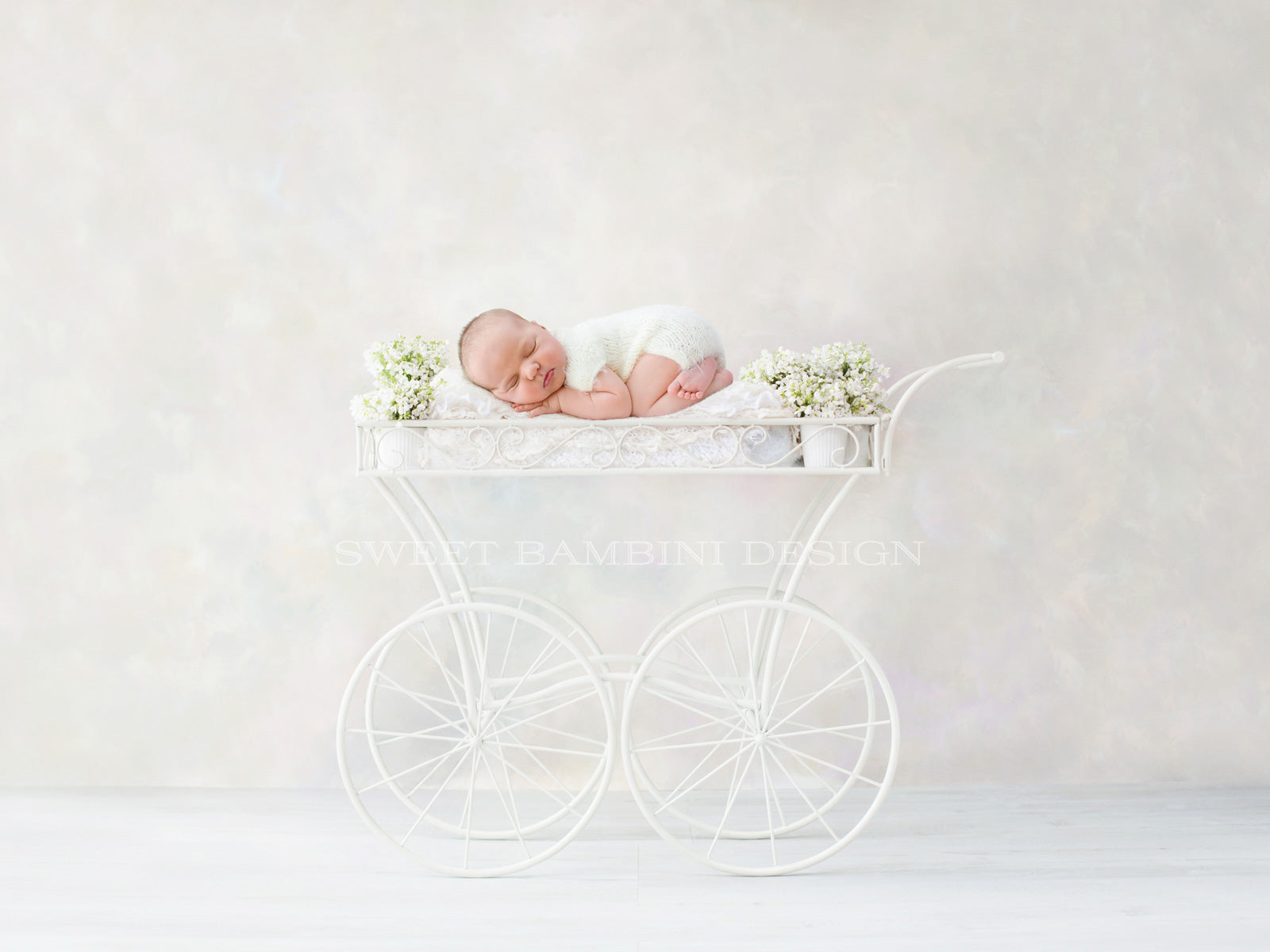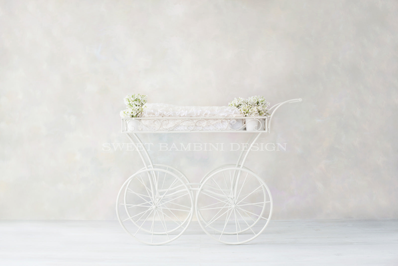 Newborn Photography Digital Photography Backdrop - Beautifully simple white, ornamental carriage, with little pots filled with fresh white flowers.