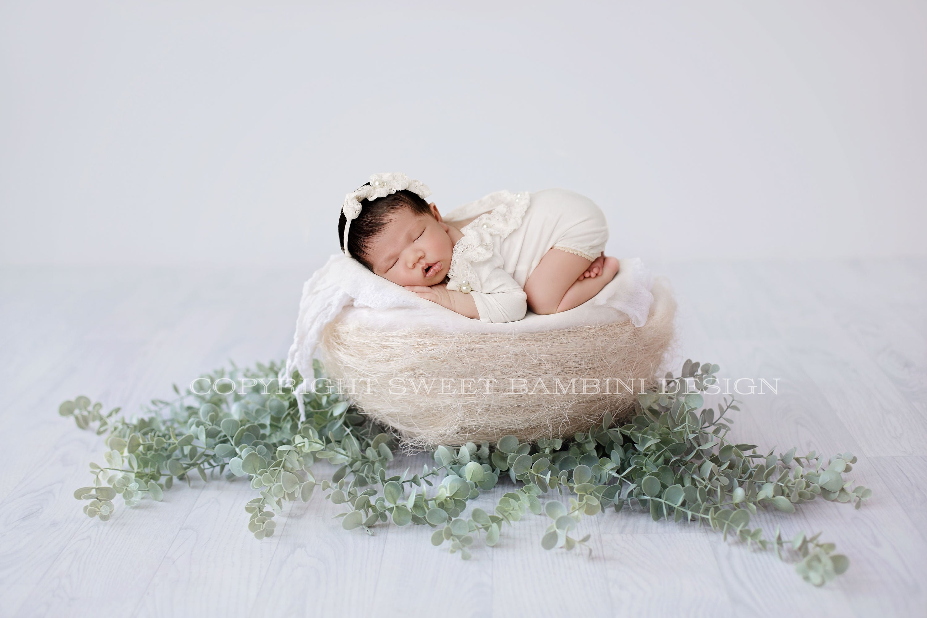 Simple little white nest, shot from the front, decorated with eucalyptus leaves. Perfect for newborn tushie up or side on poses.