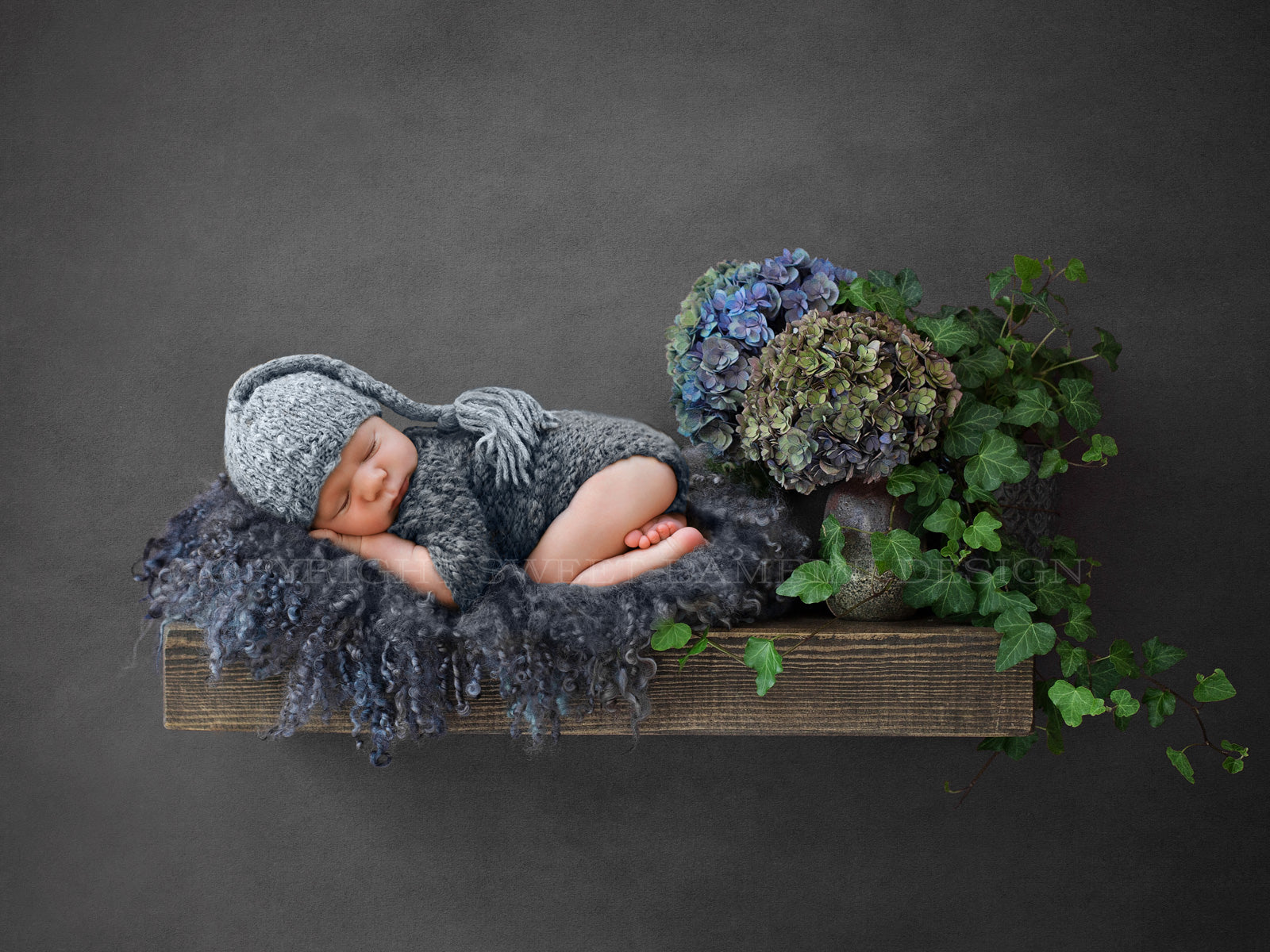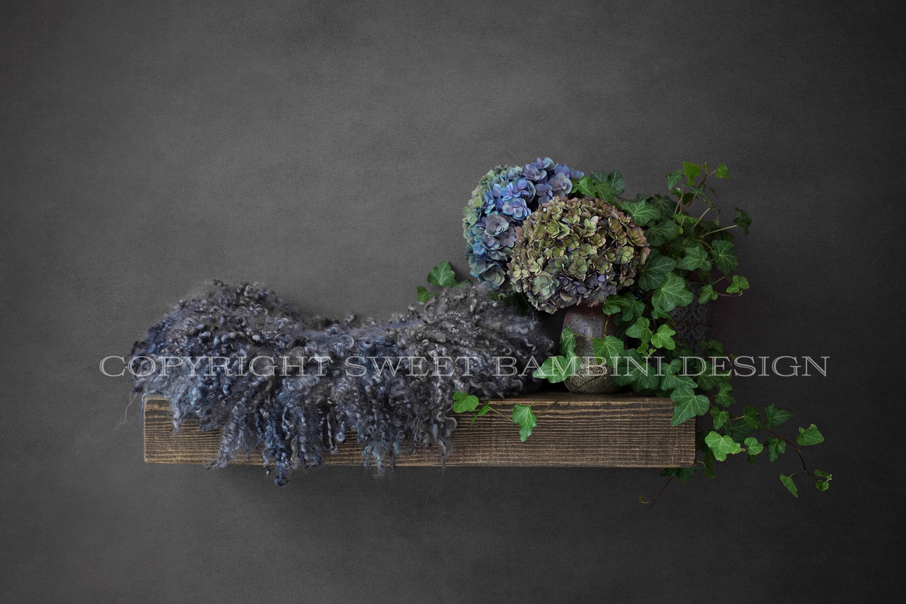 Newborn Digital Backdrop - Chunky wooden shelf backdrop with ivy and fresh hydrangeas shot against a rich grey textured background.