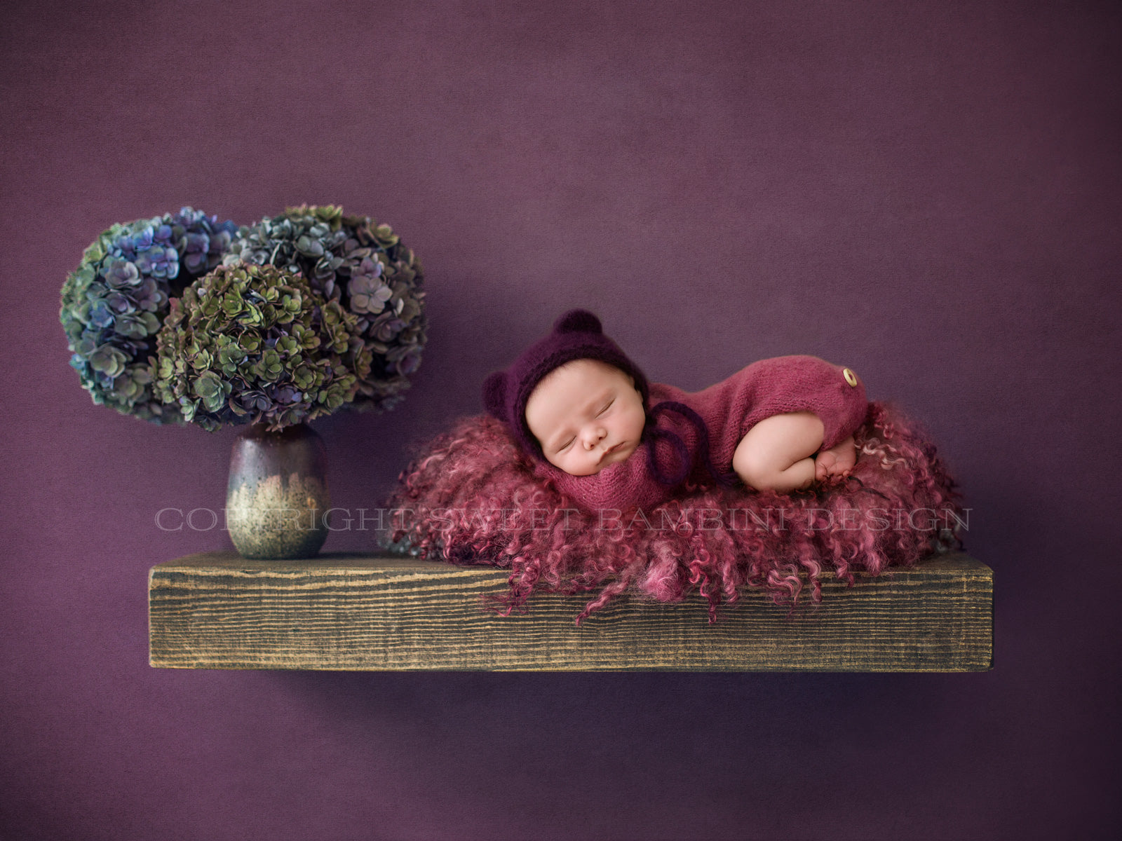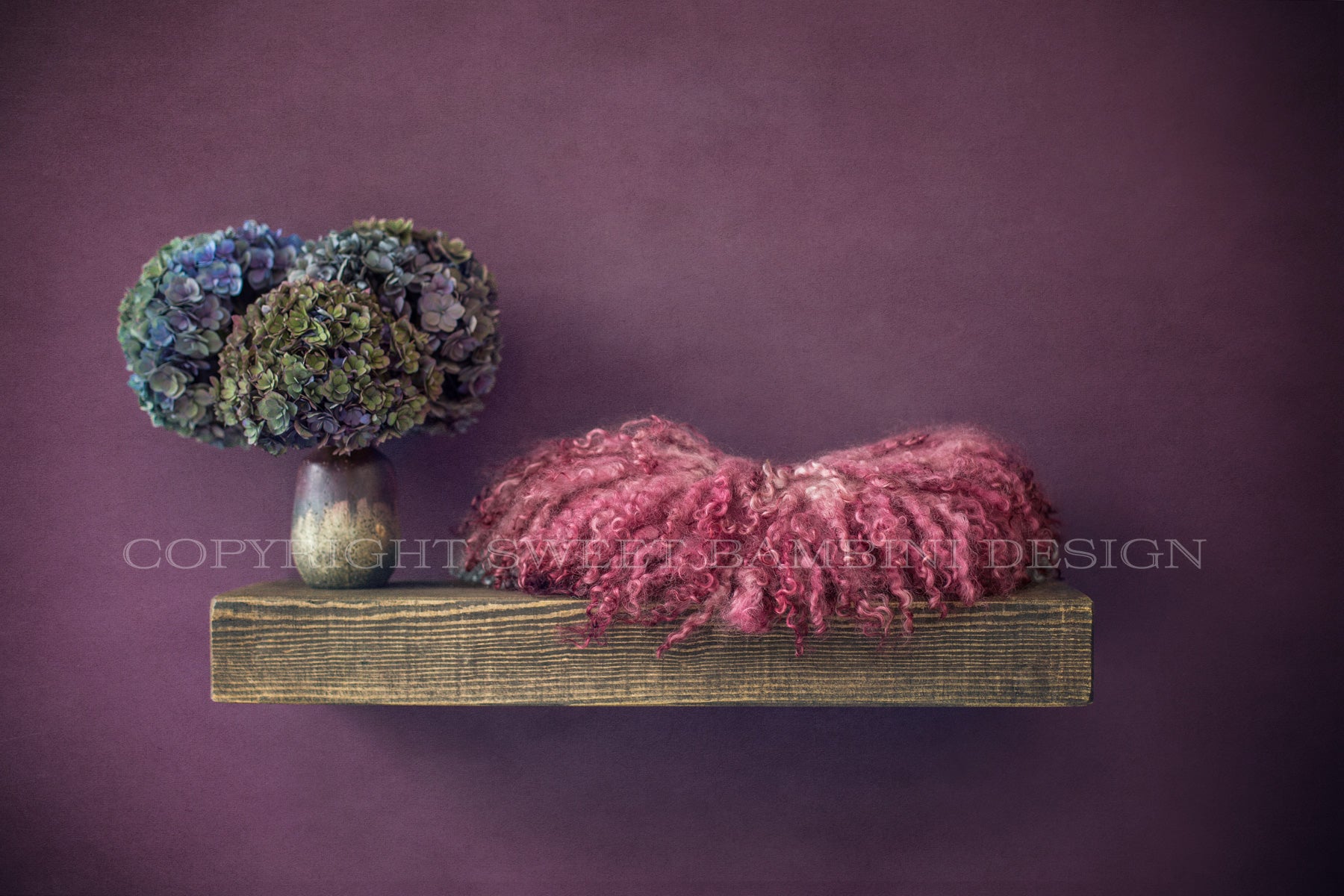 Newborn Digital Backdrop - Chunky wooden shelf backdrop with a deep pink fluffy nest, gorgeous fresh hydrangeas all in rich colours.