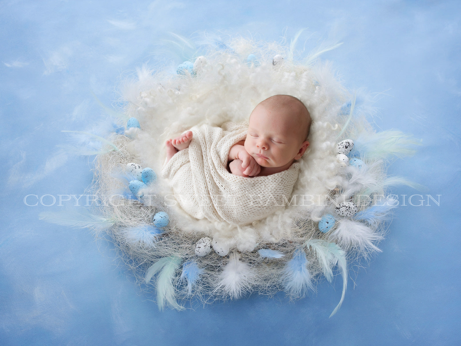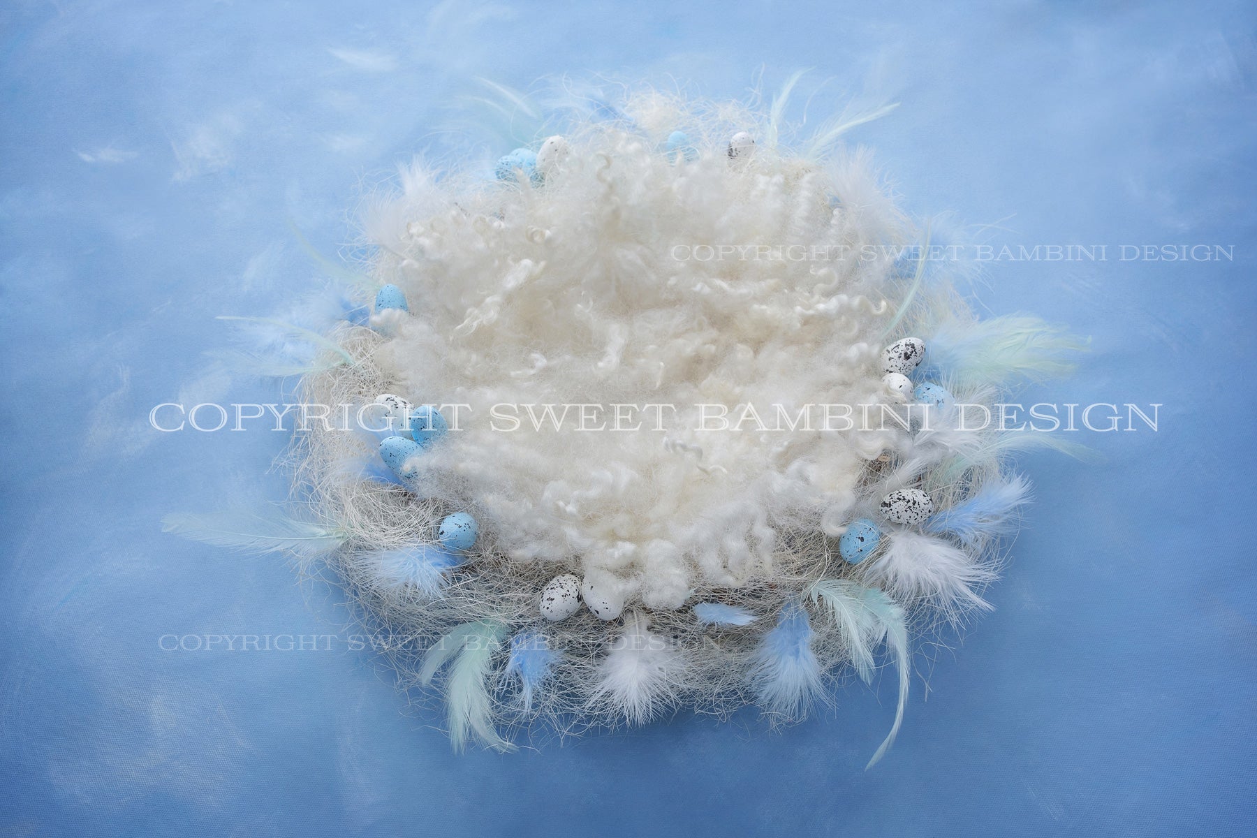 Side view newborn Digital Backdrop - beautiful little fluffy natural nest, with a white middle, decorated with little eggs & shades of baby blue feathers, perfect for springtime or Easter. Shot on a hand painted, lightly textured blue canvas.
