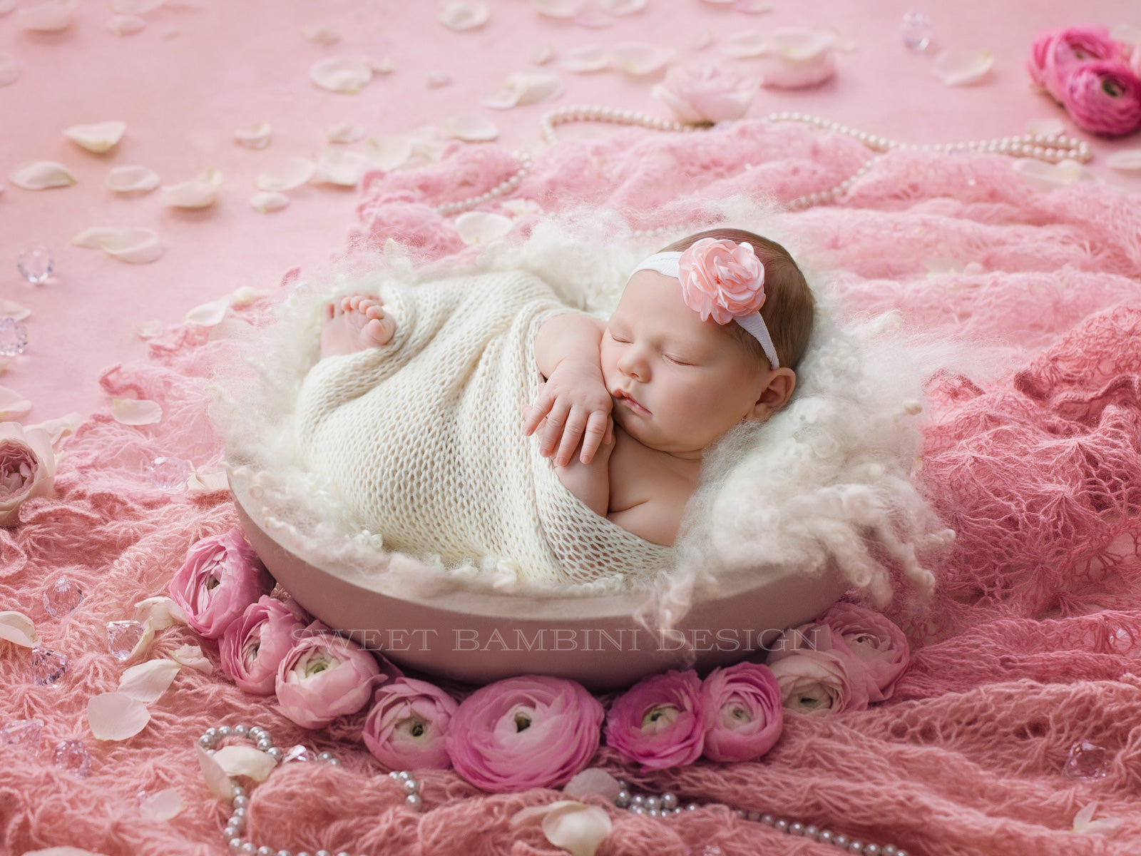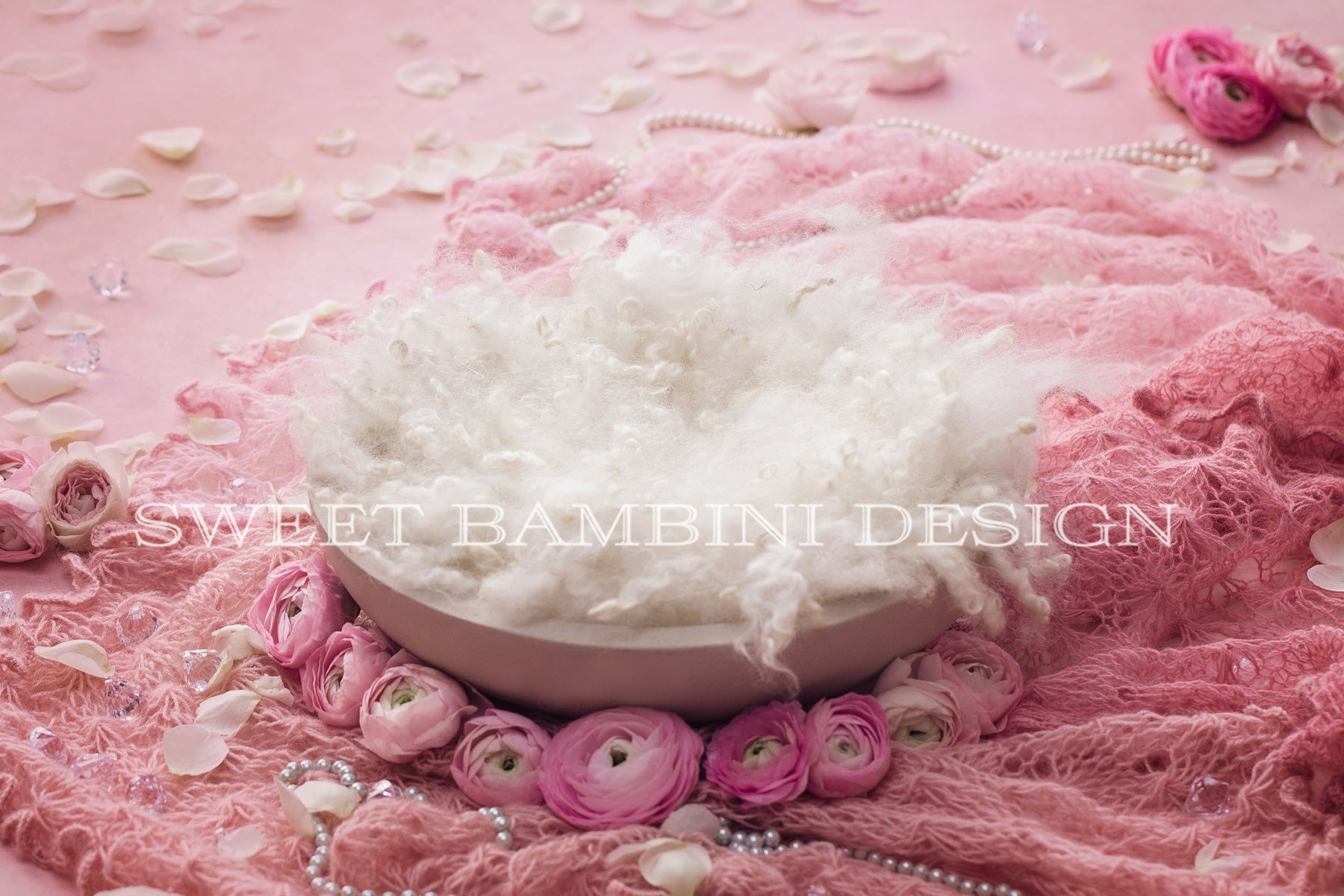 Decorated with beautiful little details - strings of pearls, little diamonds, lace knit blanket and fresh rose and ranunculus flowers. The bowl is filled with off white/cream fluff. Beautifully feminine.