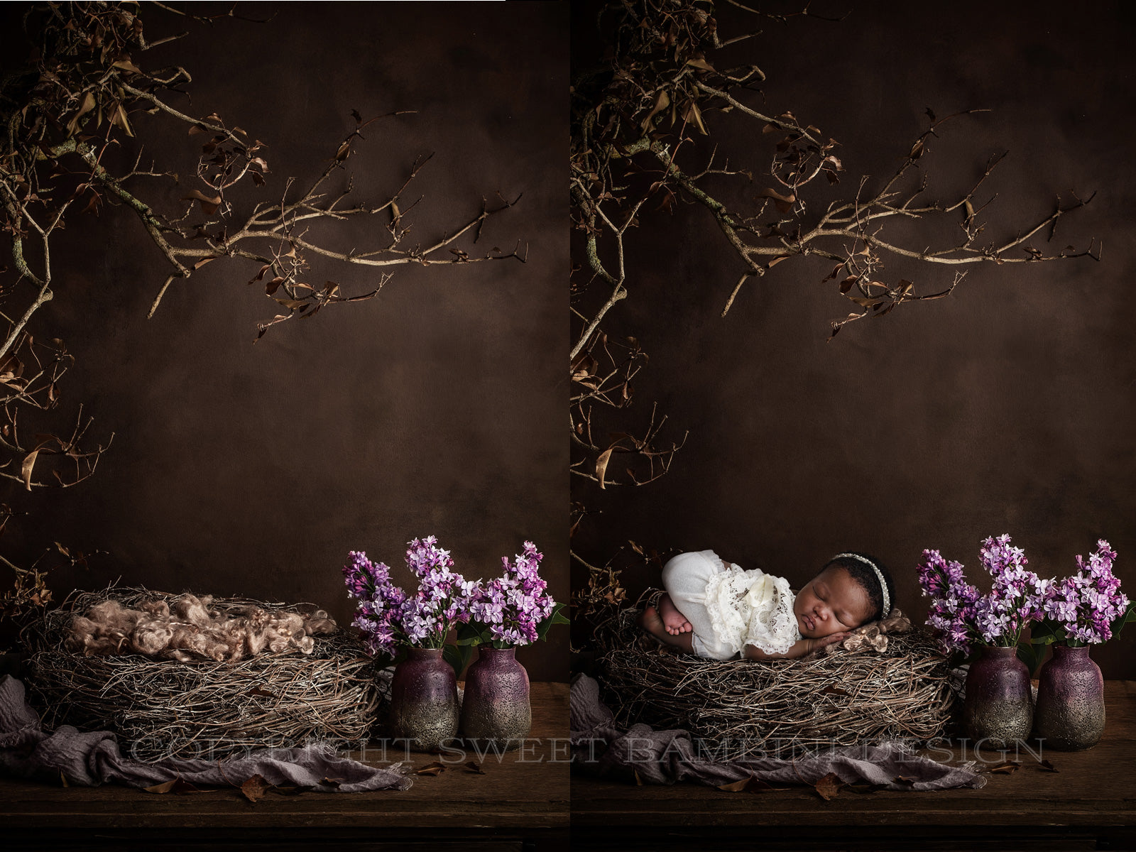 Natural World Newborn Digital Background - Rustic Nest with Fresh Lilac on Textured Background, Instant Download, Ready for you to Edit