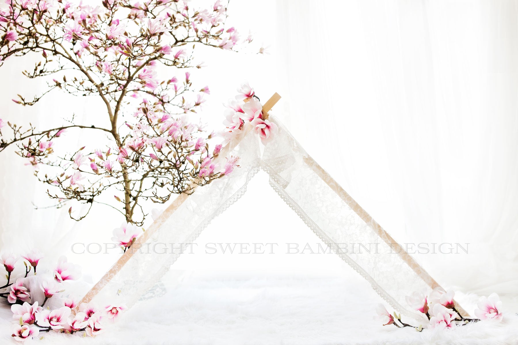 Digital Photography Backdrop - beautiful setting in a lace tent under real Magnolia Tree, lit with natural light. This template is backlit which means the composite should be nice and easy if you normally shoot against big light sources.