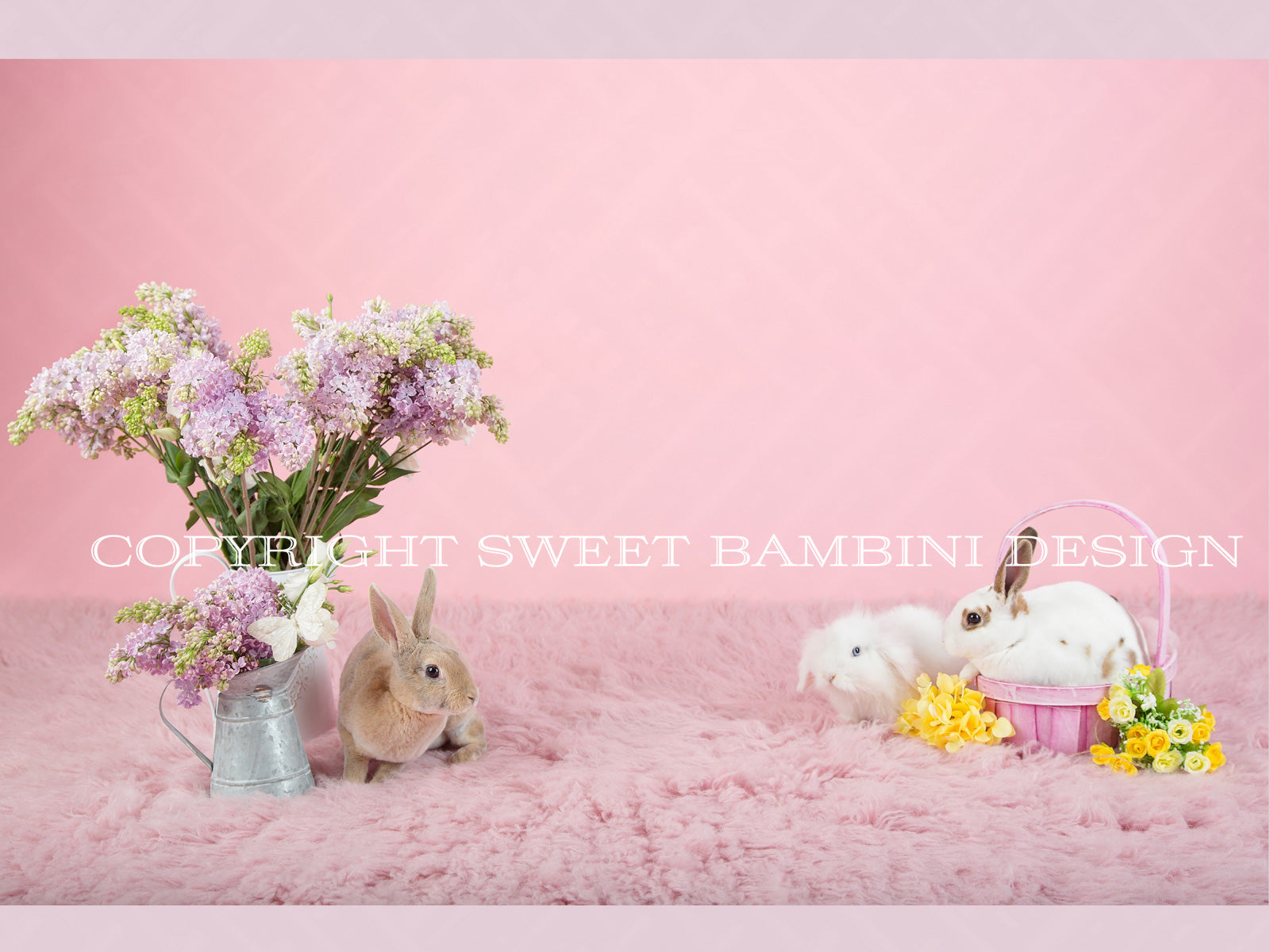 Digital Photography Backdrop - cute little pink set up, with real bunnies and fresh flowers, ideal for sitters.