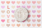 Watercolor effect "LOVE" backdrop. Pink and warm neutral love hearts on an off-white textured background.