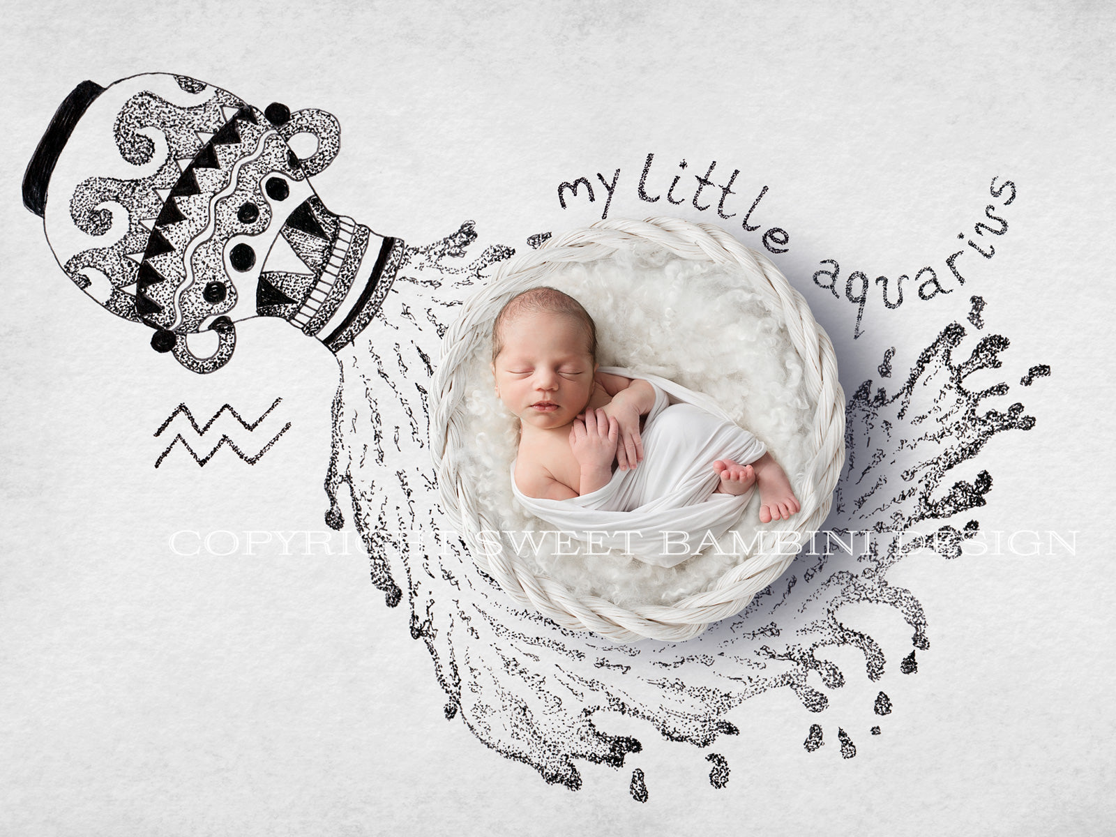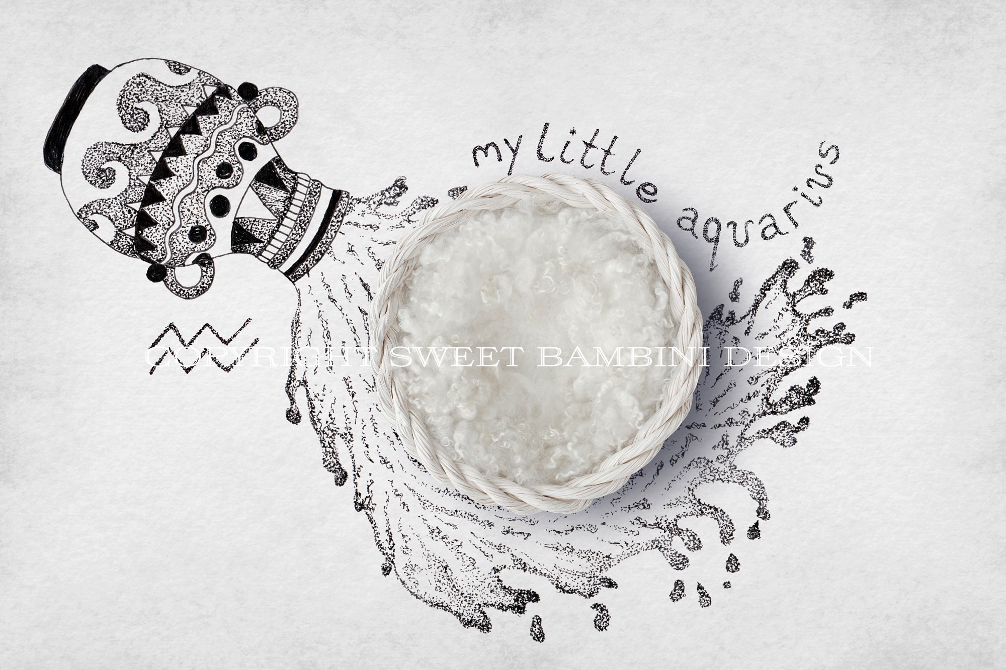 Horoscope newborn digital backdrop - AQUARIUS baby, white basket