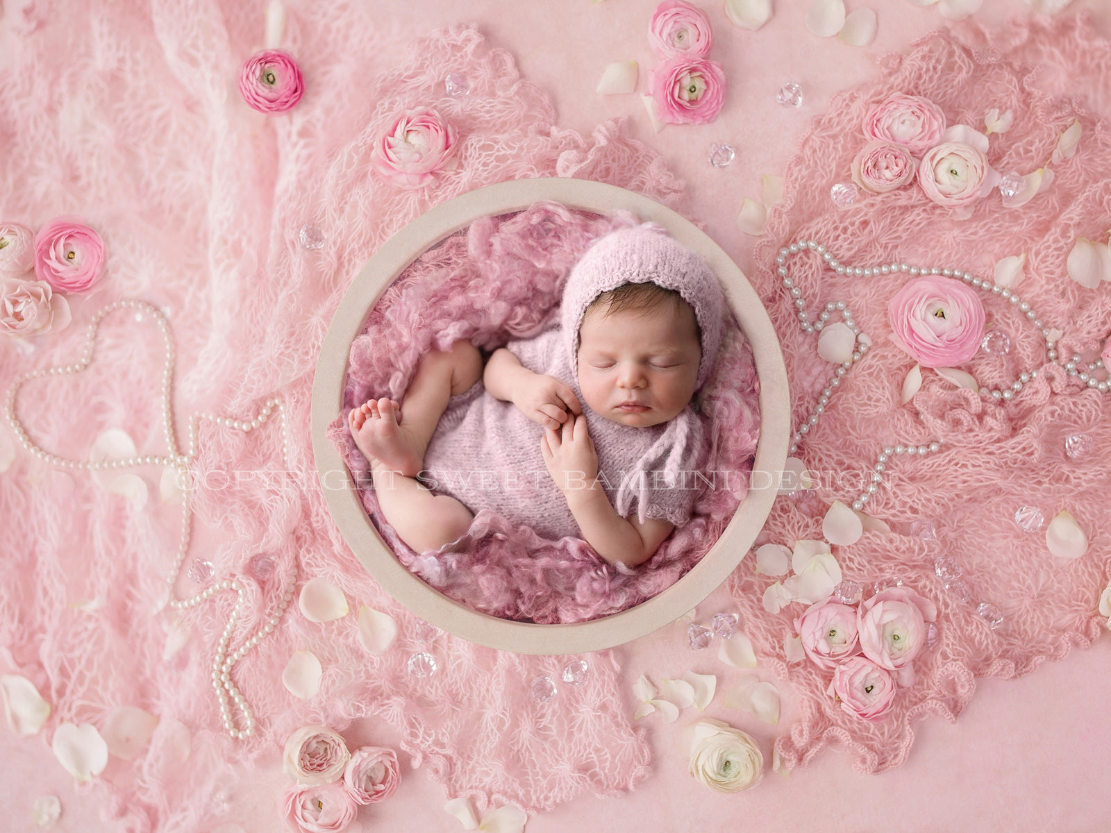 Newborn Digital Backdrop for girls - Simple white bowl shot on a pink background with pearls and roses