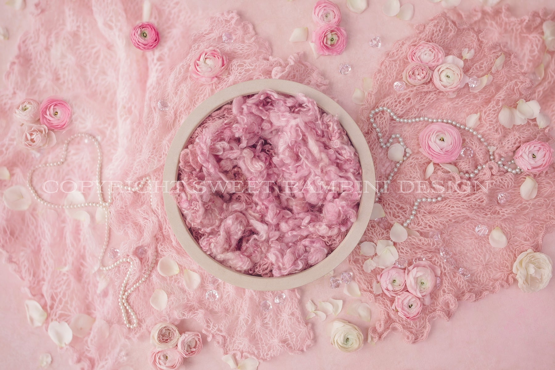 Newborn Digital Backdrop - Simple cream bowl shot on a light pink hand painted textured backdrop. Decorated with beautiful little details - strings of pearls, little diamonds, and fresh rose and ranunculus flowers and a pink middle.